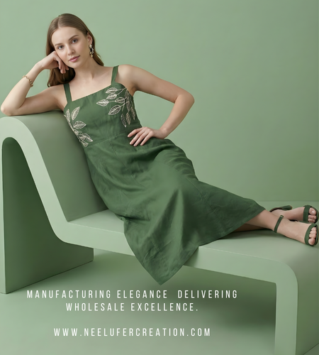 A refined cotton dress with handcrafted embroidery on the bodice, perfect for contemporary daywear. Manufactured by experienced manufacturers & wholesalers ensuring comfort and quality.