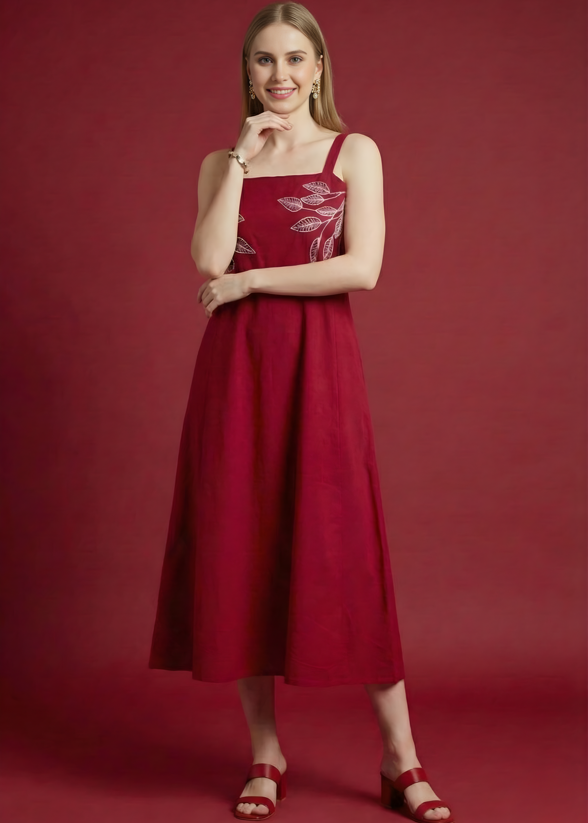 A graceful maroon cotton midi dress featuring fine leaf embroidery and a flattering silhouette. Crafted by expert manufacturers & wholesalers for premium comfort and bulk supply.