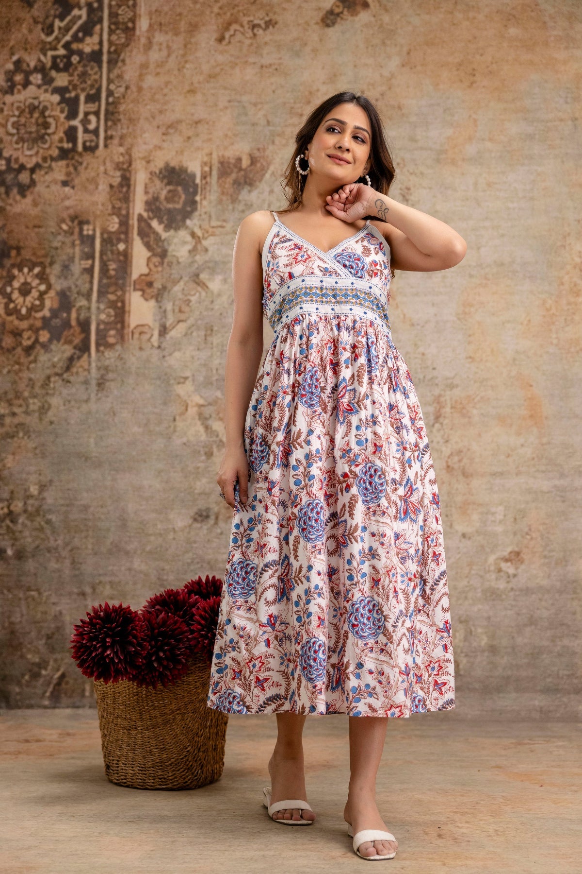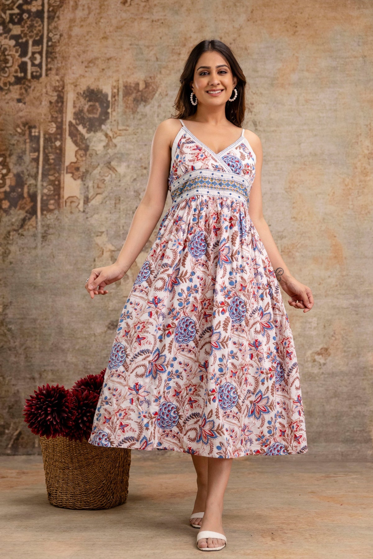 Material: Pure Cotton | Top: Printed Midi Dress | Bottom: Not Applicable | Dupatta: Not Included | Size: S – M – L – XL / 36 – 38 – 40 – 42 | Neckline: V-Neck | Sleeves: Sleeveless with Shoulder Straps | Top Length: Midi Length | Bottom Length: Not Applicable | Value Addition: Breathable Fabric, Floral Print, Flowing Silhouette | Dispatch Status: Ready to Dispatch